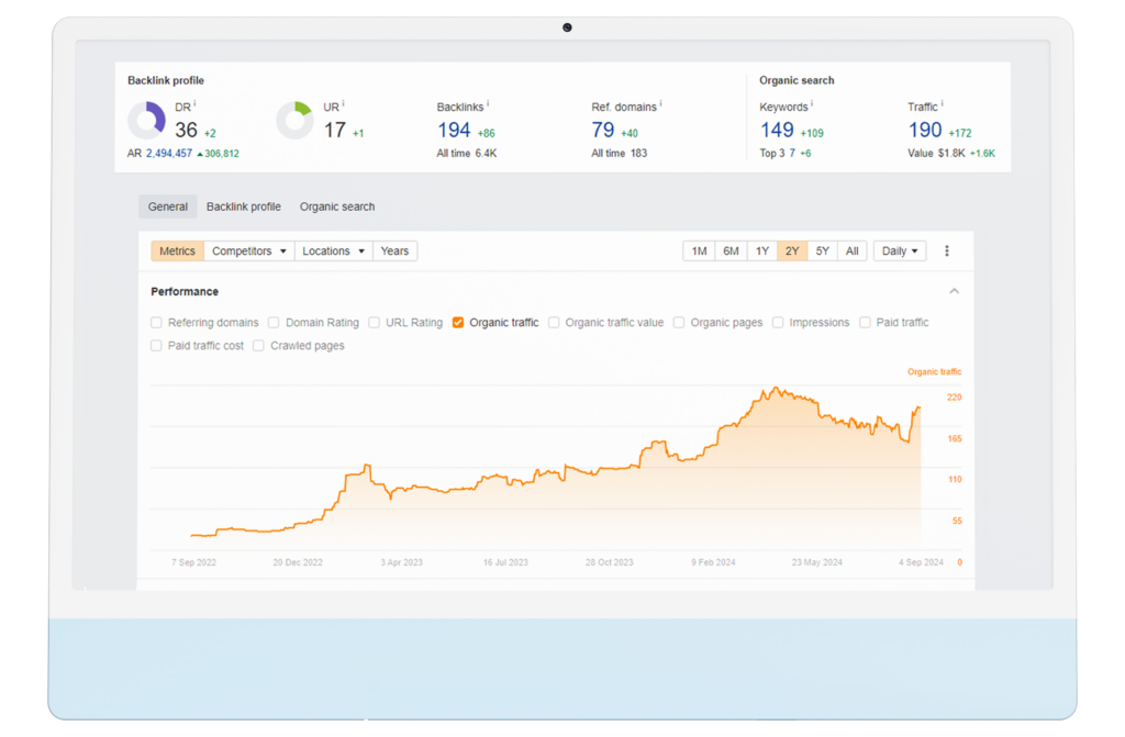 - Organic traffic grew by a staggering +172, with 190 monthly visits coming in from organic search alone.